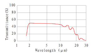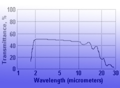 Germanium is a high index material that is used to manufacture Attenuated Total reflection (ATR) prisms for spectroscopy. Its refractive index is such that germanium makes an effective natural 50% beamsplitter without the need for coatings. It is also used extensively as a substrate for production of optical filters. Germanium covers the whole of the 8-14 micron thermal band and is used in lens systems for thermal imaging. It can be AR coated with diamond producing an extremely tough front optic. Its transmission is very temperature sensitive, becoming opaque near 100°C. Environment does not cause problems because Germanium is inert, mechanically rugged, and fairly hard.