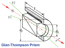 Glan Thompson polarizer is made of two calcite prisms or a-BBO prisms cemented together. Two types of Glan Thompsons are available. One is the standard form and the other is the long form. Their length to aperture ratios are 2.5 : 1 and 3.0 : 1 respectively. Glan Thompsons tend to have higher extinction ratio than air spaced polarizers. In the ultra violet spectrum, their transmission is limited by absorption in birefriengent materials as well as the cement layer. a-BBO polarizers and Calcite polarizers can be used from about 220 to 900nm and 350 to 2300 nm respectively.
